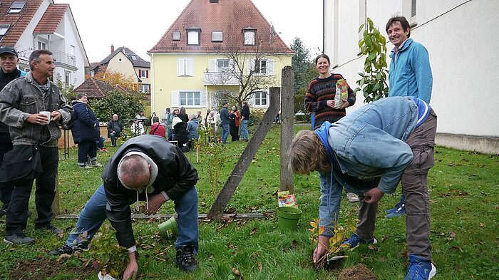 *Das Foto zeigt Teilnehmende beim Pflanzen von Stauden sowie den Initiator des Teilhabegartens, Werner Lauber (rechts).